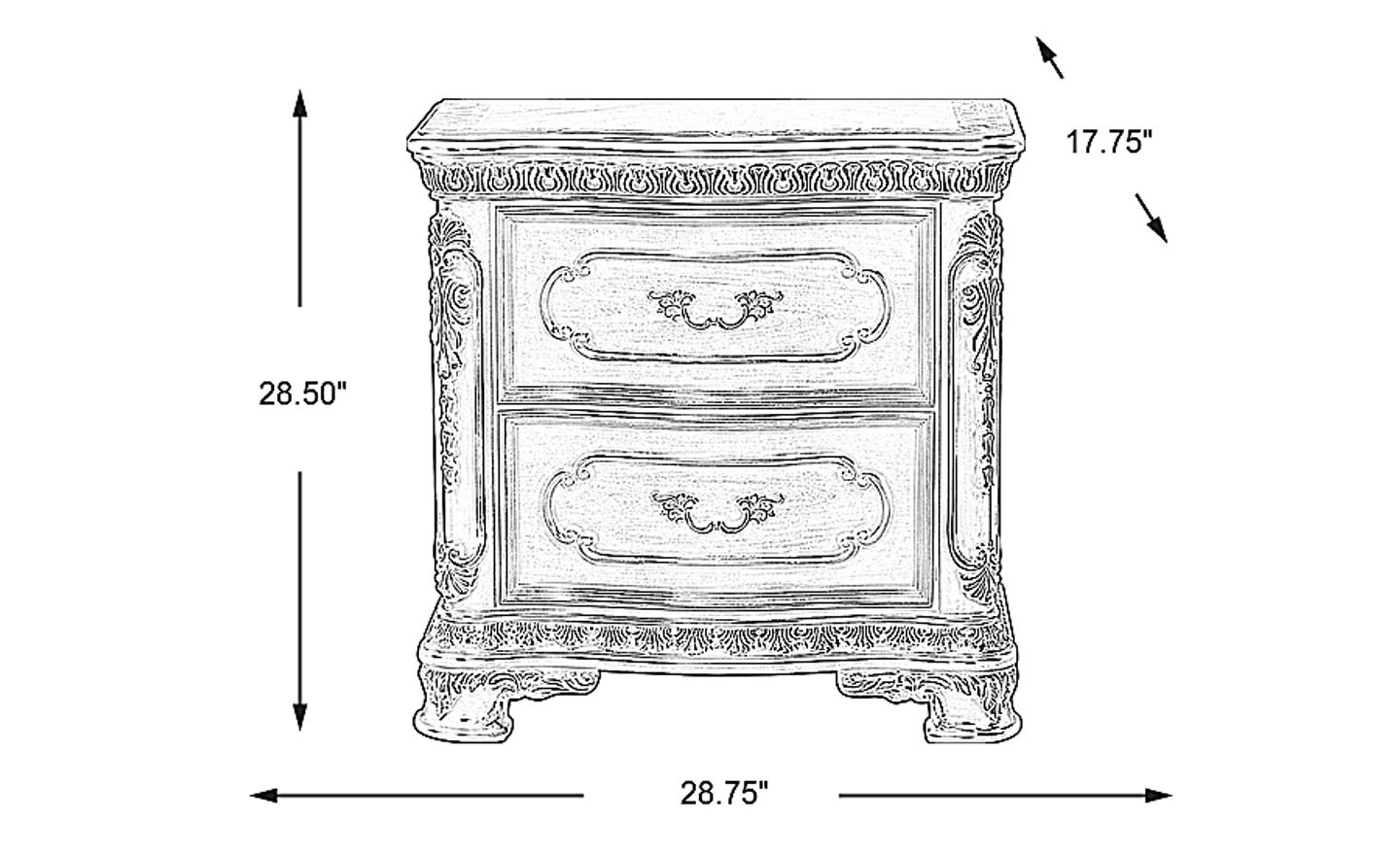 Intricate carvings, European-inspired details, and stately refinement in the Priscilla nightstand offer a royal welcome every evening. Cherry veneers accentuated by a rich brown cherry finish are carved into delicate scrolls and organic shapes, inspired by traditional Victorian style. The texture and depth of this handsome piece are enhanced by botanical onlays set into either side. Leaf scroll designs complete the ornate legs and base trim. This nightstand has two drawers, with elegant metal pulls in a rubbed antique bronze finish.