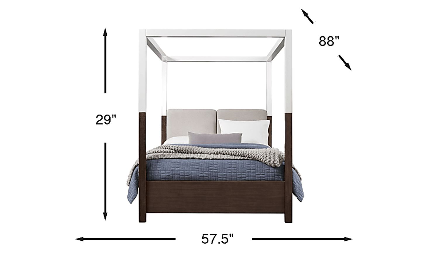 Sleek lines and refined details give the Prospect Heights bed the easy grace of a sophisticated uptown retreat. This contemporary canopy bed features elm veneers stained a rich dark brown and complemented with bright white details for balanced, airy contrast. An upholstered headboard in beige adds a soft touch, and the white finish on the frame reaches from the middle of the four posts to the top of the canopy for a two-tone look.