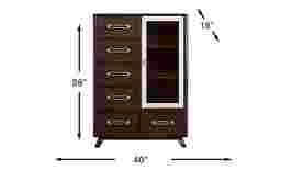 Sleek lines and refined details give the Prospect Heights chest the easy grace of a sophisticated uptown retreat. This contemporary piece features elm veneers stained a rich dark brown and complemented with bright white details for balanced, airy contrast. Six spacious drawers offer room for all the essentials, and the glass door framed in white adds an interesting display option and asymmetrical detail. For the final touch, this piece also features uniquely shaped gold-finished bar pull hardware.
