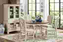 The graceful ease of a sun-drenched morning in a countryside manor comes home in the Provence collection's timeless character, thoughtful craftsmanship and natural textures. This inviting dining room features a two-toned table with a round, rich brown oak veneer top, perfectly balanced by a warm white base crafted with birch veneers. The striking double pedestal design brings a graceful hourglass silhouette that rests on a layered cross-shaped plinth bottom, delivering a touch of traditional elegance. White matching side chairs with sculpted backs and carved overlay details include soft gray upholstered seat and back cushions for comfort, while gently angled legs lend an air of tailored refinement.