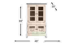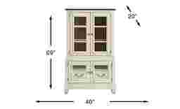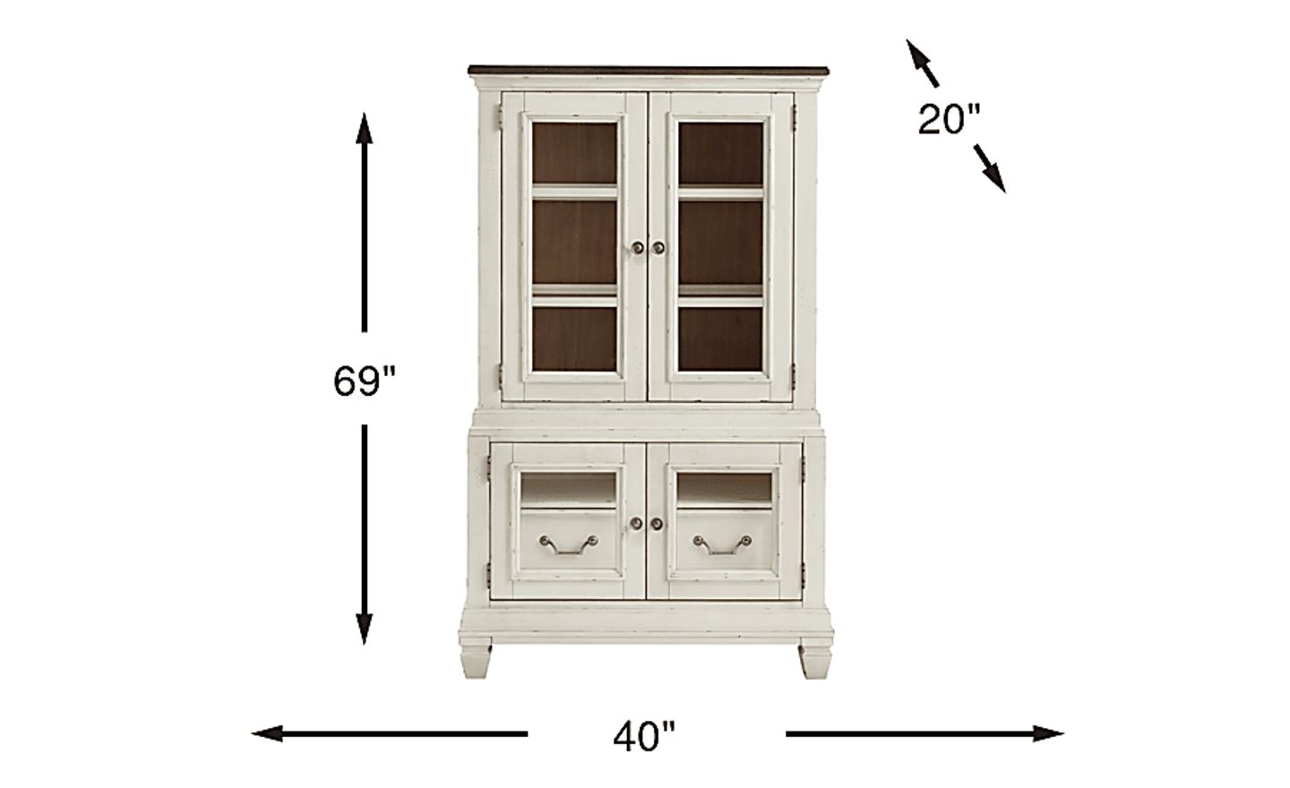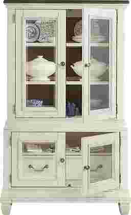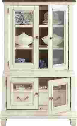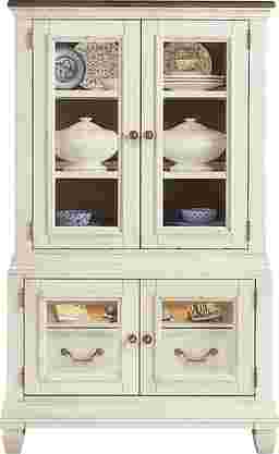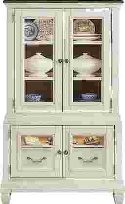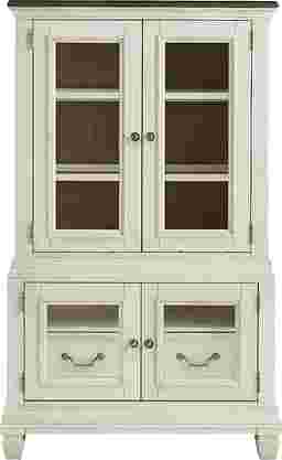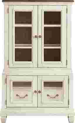 The graceful ease of a sun-drenched morning in a countryside manor comes home in the Provence collection's timeless character, thoughtful craftsmanship and natural textures. This two-toned curio comes in a warm white finish and features a rich brown top for a bold yet elegant contrast. Architectural depth is highlighted throughout with its graceful, tiered form and detailed molding. Two bottom doors feature small glass windows and silver drop-bale style pulls for added sophistication. Above, two glass inlayed doors with silver knobs provide extra storage and display space to showcase decorative dinnerware.
