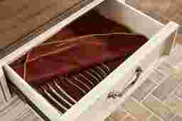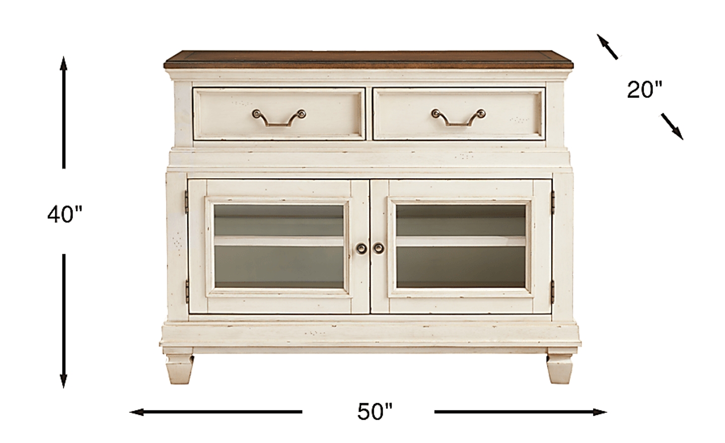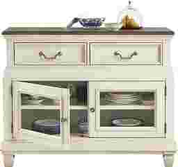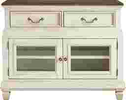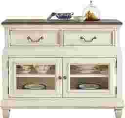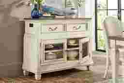 The graceful ease of a sun-drenched morning in a countryside manor comes home in the Provence collection's timeless character, thoughtful craftsmanship and natural textures. This two-toned server comes in a warm white finish and features a rich brown top for a bold yet elegant contrast. Architectural depth is highlighted throughout with its graceful, tiered form and detailed molding. Two bottom doors with glass inlays open to reveal spacious shelving for your dining essentials, while two top drawers slide out for extra hidden storage. Silver knobs and drop-bale style pulls add sophisticated and refined touch.