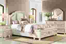 The graceful ease of a sun-drenched morning in a countryside manor comes home in the Provence collection's timeless character, thoughtful craftsmanship and natural textures. Boasting birch veneers in a white finish, this traditional bed brings elegant charm with detailed molding and tapered bun feet. The drop-shoulder headboard showcases triple upholstered panels in gray fabric accentuated with a nailhead trim for added definition, while the footboard offers an upholstered bench with two spacious drawers for enhanced versatility. Mattress and foundation (if required) sold separately. Bed shown is queen size.