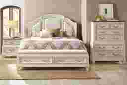 The graceful ease of a sun-drenched morning in a countryside manor comes home in the Provence collection's timeless character, thoughtful craftsmanship and natural textures. Boasting birch veneers in a white finish, this traditional bedroom brings elegant charm with detailed molding and tapered bun feet. The drop-shoulder headboard showcases triple upholstered panels in gray fabric accentuated with a nailhead trim for added definition. The footboard offers an upholstered bench with two spacious drawers for enhanced versatility. Matching pieces highlight architectural depth through their graceful, tiered forms. The nightstand includes integrated LED lights for a soft ambient glow, along with built-in USB ports for convenient device charging. Silver drop-bale style pulls provide a sophisticated finishing touch. Mattress and foundation (if required) sold separately.