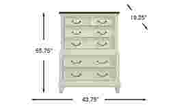 The graceful ease of a sun-drenched morning in a countryside manor comes home in the Provence collection's timeless character, thoughtful craftsmanship and natural textures. Boasting birch veneers in a white finish, this traditional chest brings elegant charm with detailed molding and tapered bun feet. Its graceful, tiered form highlights architectural depth, while the brown finished top adds a striking contrast and lifts to reveal a mirror and jewelry management inserts. Five drawers constructed with English dovetail joints in the back, French dovetail joints in the front and side-mount, full-extension glides function with ease and durability. Silver drop-bale style pulls provide a sophisticated final touch.