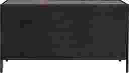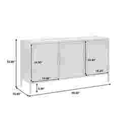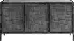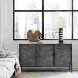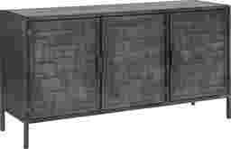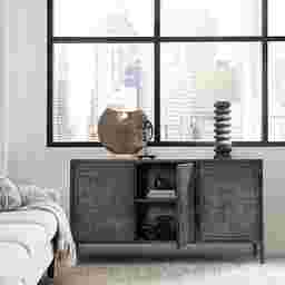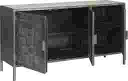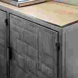 The Quadgate gray sideboard offers the perfect blend of contemporary design and practical functionality. It features a gray-colored metal cabinet and doors with a stacked pattern design on the front of the doors. A fixed shelf behind the doors provides additional storage, allowing for better organization of items such as dishes, glassware, or other household essentials. A contrasting light mango wood top creates a pleasing contrast, softening the overall look and making the sideboard more versatile for casual and modern settings.