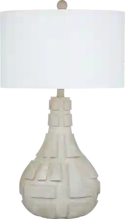 The Quarrystone Home lamp is crafted of bulb shaped resin base finished in a natural gray cement. The 3D geometric carvings are highlighted with gold brush rubbing. The table lamp also includes a white linen drum shade. The hand crafted details are produced by a skilled artist, lending itself to a unique technique and which may feature slight variations between each piece. Partial assembly may be required.