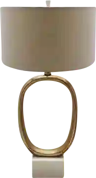 An intriguing accent light featuring transitional style the Quincy Way lamp has an aluminum oval-shaped frame with a brass finish a marble base and a bold black shade. The shiny brass color of the frame and white base provide a strong contrast to the black drum shade. Suitable for any home this table lamp is an excellent option for an office foyer bedroom or living room. Partial assembly may be required.