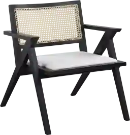 This chair is designed as a versatile bridge between Mid-Century Modern and Coastal aesthetics. The stark, angled black frame provides the clean lines and structural "motion" characteristic of Mid-Century chic, while the natural rattan back and white linen cushion add the organic textures essential for Coastal or Bohemian-inspired decor. It serves as a sophisticated statement piece that can either anchor a minimalist room or soften a more traditional layout.