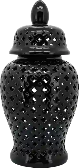 Historically used for storage, temple jars have evolved into iconic decorative accents known for their classic high-shouldered silhouette. This specific jar features a "Temple" style with a 24-inch height, making it a substantial statement piece. Our styling experts recommend placing it as a focal point on a large console table or using it to add visual interest to a fireplace mantel. Its glossy black finish and intricate "Daisy" cut-outs offer a sophisticated way to introduce texture into traditional or transitional decor.
