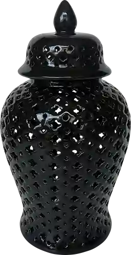 While the temple jar is a hallmark of traditional decor, the bold black finish and daisy cut-out pattern allow it to transition into modern and transitional spaces. It serves as an excellent "neutral" anchor in a room, providing contrast against light-colored walls or complementing other dark wood furniture and metal accents.