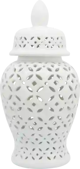Decorate your fireplace or console table top with this stunning Railsback temple jar. A daisy cut out temple jar design with a glossy finish. An elegant way to enhance your home interior and bring neutral colors into any room.