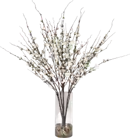 The Raina faux plant is effortlessly arranged as if freshly harvested, these quince branches exemplify the true characteristics of live blooms. Varying in stages of openness, cream buds are accented by natural rocks in a clear glass vase.