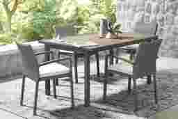 Seaside resort opulence and relaxed backyard barbecue vibes combine with the modern-yet-classic design of the Randolph collection. This dining chair features an aluminum frame wrapped in gray all-weather wicker accents and contrasting panels on each gently curved arm. The cushion in durable gray outdoor fabric is UV-resistant and easy to maintain.