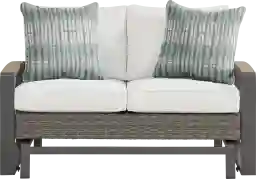 Seaside resort opulence and relaxed backyard barbecue vibes combine with the modern-yet-classic design of the Randolph collection. This loveseat features an aluminum frame wrapped in gray all-weather wicker accents and contrasting panels on each gently curved arm. Welted cushions in durable gray outdoor fabric are UV-resistant and easy to maintain. The gliding rocking function adds easy, comforting motion.