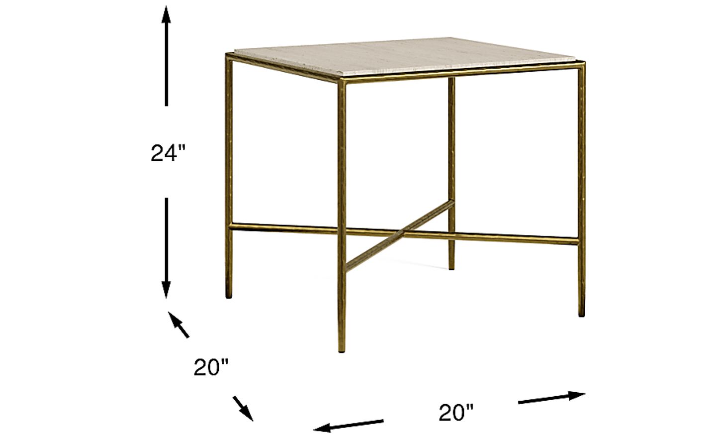 Balancing graceful form with warm, natural elegance, the Rangel collection brings a sense of refined harmony. Perfect for holding drinks or highlighting curated decor, this transitional end table offers a charming accent for your space. Featuring a square metal frame in a luxurious gold finish and a stone-inlaid top that showcases an ivory hue with gray and brown notes, classic beauty is reflected in every angle. Slender, round legs echo subtle opulence, while the interconnected base brings the look together with effortless sophistication.