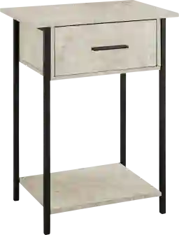 Elevate the style in your living room with the Rankiny cream end table. The sleek design features a cream stone laminate finish and black metal legs, adding a contemporary touch to your space. The practical shelf at the bottom and convenient storage drawer with a metal pull provide ample space for your essentials, while the space saving design makes it perfect for small spaces. This table is durably designed with quality materials and easy to assemble with illustrated instructions included. Place a lamp, decorative item or books on the easy to clean laminate top for an end table that not only has fashionable style but also functional. Customer assembly is required.