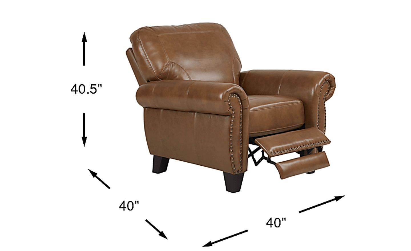 The Rapallo recliner combines the look of a classic club chair with the added comfort of reclining seating. Double stitch detailing, brass finished nailhead trim, high quality top grain leather where the body touches and block legs are part of the timeless appeal of this piece. The rich saddle brown color and rolled arms add charm, while a boxed seat cushion and padded footrest promises comfortable support. Upholstery: Top grain leather where the body touches and polyurethane fabric sides and backs.
