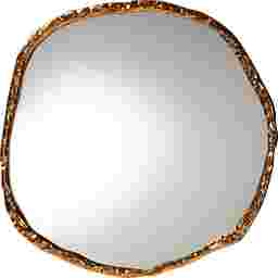 The Ravenbeat gold mirror features a hammered wood frame and bold geometric design. Fully assembled and ready to mount.