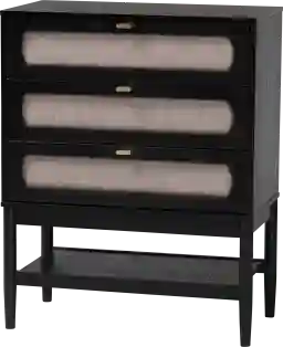 Savor a tranquil ambiance while organizing your bedside with the Ravenfly black chest. This mid-century inspired piece is crafted from sturdy wood while each drawer front is upholstered in soothingly soft fabric. Three interlocking drawers offer convenient storage space for clothes while reserving the open shelf and tabletop as fantastic display areas. The Ravenfly is adorned with a sleek metal drawer pull that radiates minimalist charm. Tapered legs accentuate the sleek geometry of the piece, making the Ravenfly a fantastic bedside accessory. Customer assembly is required.
