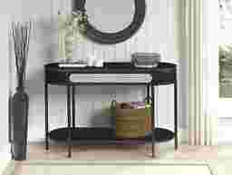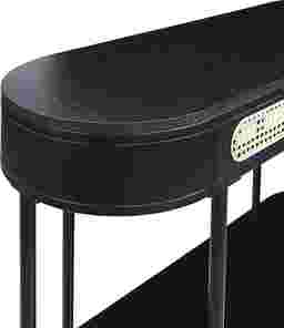 The Ravensaide black sofa table adds a nature-inspired accent to any home and features excellent craftsmanship and attention to detail. Its curved silhouette and mixed materials give this piece a cozy modern look and breezy aesthetic. The rattan insert mixed with the black finish is stylish. The Ravensaide is a creative play on texture, tone, and style.