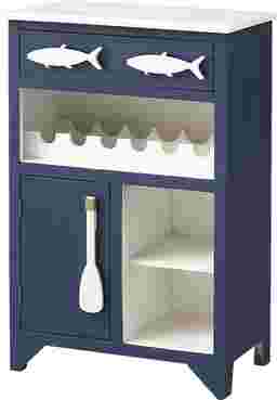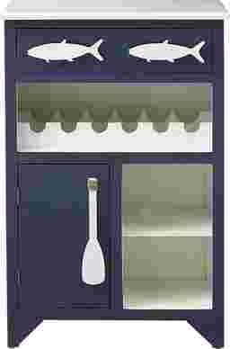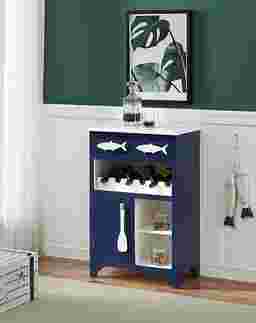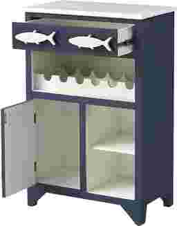 Just in from the beach or poolside and looking for a refreshing beverage? This adorable Raynale wine server in a blue and white finish is exactly what you need in your sun room or screened in porch to keep those supplies close at hand. The single drawer on top is adorned with fish, and just the place for napkins and openers. Plus there is bottle storage, two open compartments, and a larger storage area behind the single door! Cute and functional!! Customer assembly is required.