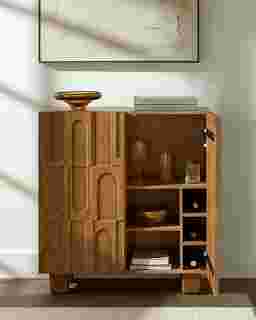 Introducing the Razin bar cabinet, a stunning addition that effortlessly elevates any space with its sophisticated allure. Crafted from exquisite mango wood and meticulously manufactured in India, this cabinet brings a touch of worldly elegance to your home. Its versatile style seamlessly integrates into various decors, making it an ideal choice for those who appreciate beauty and functionality in equal measure. Designed to be both practical and stylish, the Razin bar cabinet is perfect for organizing your bar essentials while serving as an eye-catching centerpiece. Easy to maintain, simply wipe clean with a damp cloth to preserve its natural charm -- no harsh cleaners required. Transform your living area with this captivating piece that blends modern aesthetics with timeless appeal. Customer assembly required.