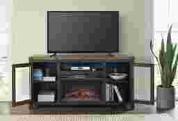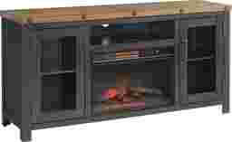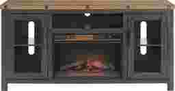 The Recton tv stand with electric fireplace offers an industrial rustic style to your living or family room. The console is constructed of solid New Zealand pine and finished in a black stain and natural finish. Five large industrial bolts span across the top while the framed glass door inserts add to the industrial look. The 65" wide and 32" height design is perfect for tv's up to 70". This tv stand offers plenty of storage space with two side cabinets, a large open storage area which is perfect for electronics. Three removable and adjustable shelves along with a permanent cubby allow for plenty of options to store cable boxes, gaming systems, audio video equipment, and other items. The custom deigned bar pulls are finished in an dark aged pewter complementing the bolts on the top. Customer assembly is required.