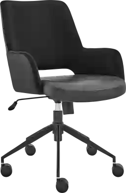 The Reder black tilt office chair rolls in with a distressed, soft leatherette seat paired with a durable fabric back and armrests. The matte black powder coated steel base glides on large 60 mm casters. Height adjustable with tilting mechanism. Customer assembly is required.