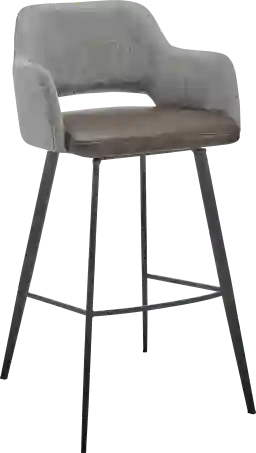The Reder brown barstool rolls in with a vintage distressed soft leatherette seat paired with durable fabric back and armrests. Matte black powder coated steel legs and footrest. Customer assembly is required.