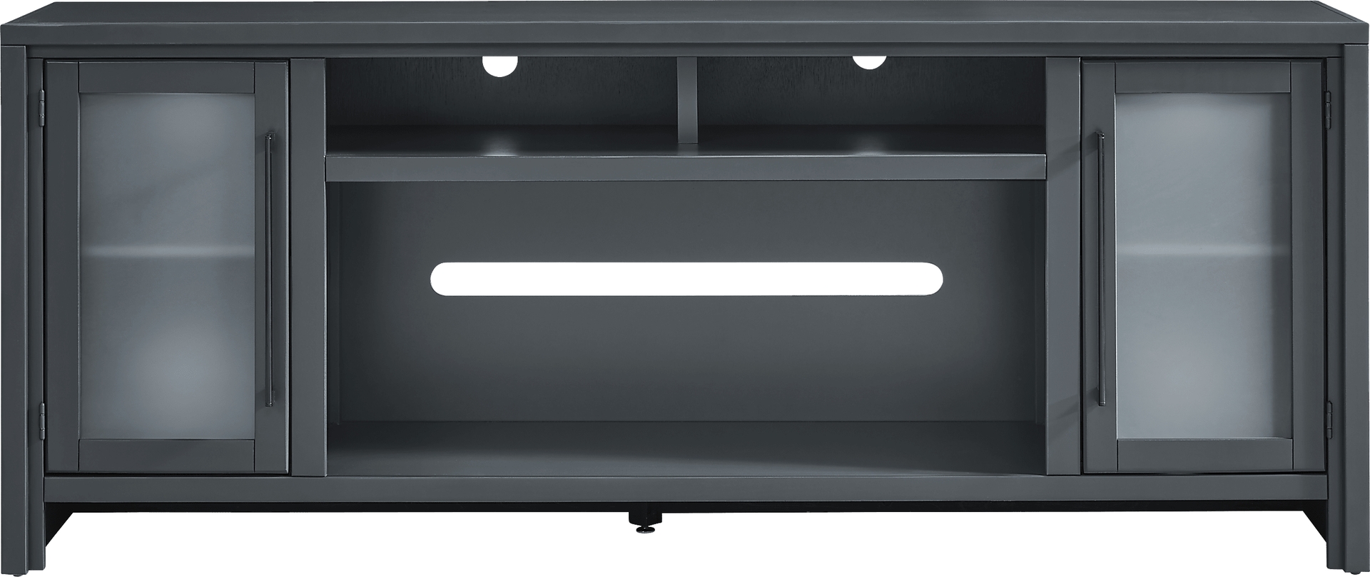 Relaxation is met with warmth and character in the Redmond console, creating a tranquil atmosphere of style and comfort. Crafted from poplar wood with maple veneers in a slate blue finish, this contemporary piece features a refined silhouette with a pristine square-shaped frame that adds simple sophistication to your space. Spacious cubbies at the center allow you to display your favorite decorations, while extra storage space lies behind two frosted glass doors with long, sleek metal handles in a black finish. For a final touch, wire management holes behind each shelf keep cords neatly concealed for all your media devices.