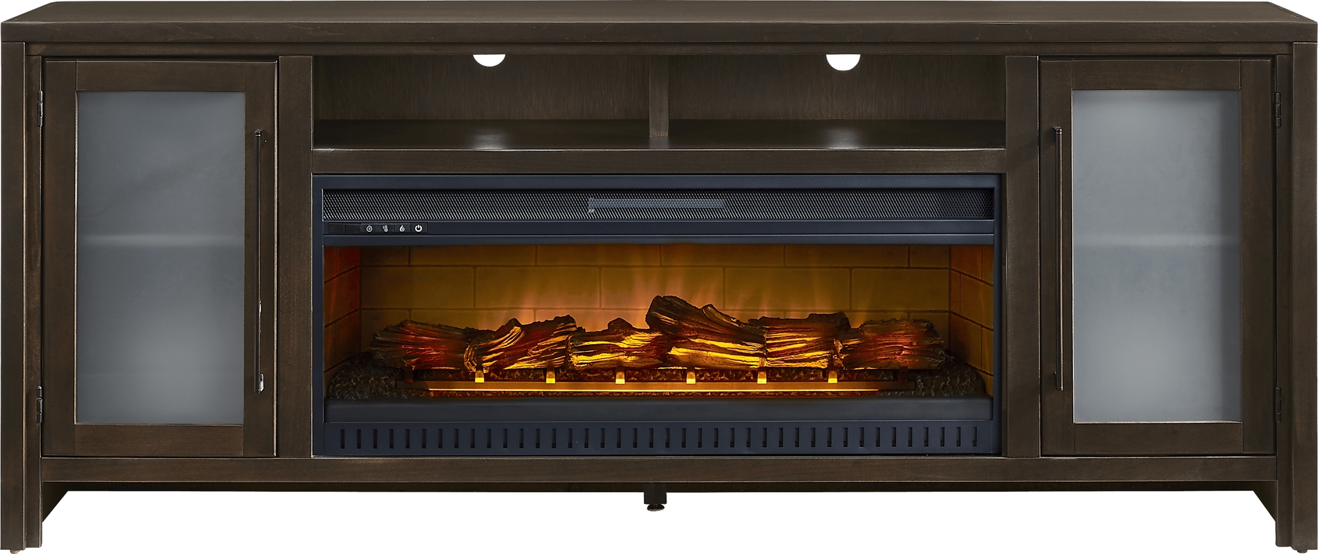 Relaxation is met with warmth and character in the Redmond console, creating a tranquil atmosphere of style and comfort. Crafted from poplar wood with maple veneers in a rich espresso finish, this contemporary piece features a refined silhouette with a pristine square-shaped frame that adds simple sophistication to your space. Two middle cubbies allow you to display your favorite decorations, while spacious storage space lies behind two frosted glass doors with long, sleek metal handles in a black finish. Below the cubby, a removable fireplace portion features flickering flames and faux embers, working with or without heat for a warm ambiance year-round. For a final touch, wire management holes behind each shelf keep cords neatly concealed for all your media devices.