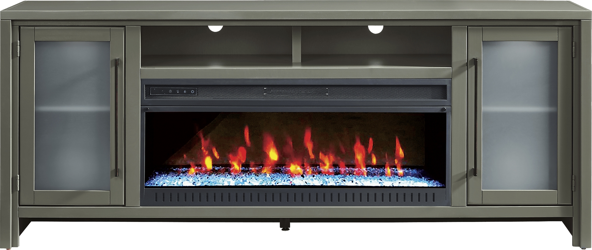 Relaxation is met with warmth and character in the Redmond console, creating a tranquil atmosphere of style and comfort. Crafted from poplar wood with maple veneers in an earthy sage finish, this contemporary piece features a refined silhouette with a pristine square-shaped frame that adds simple sophistication to your space. Two middle cubbies allow you to display your favorite decorations, while spacious storage space lies behind two frosted glass doors with long, sleek metal handles in a black finish. Below the cubby, a removable fireplace portion features a realistic energy-saving LED firebox with remote controlled heat and ambient lighting with four color changing options. For a final touch, wire management holes behind each shelf keep cords neatly concealed for all your media devices.
