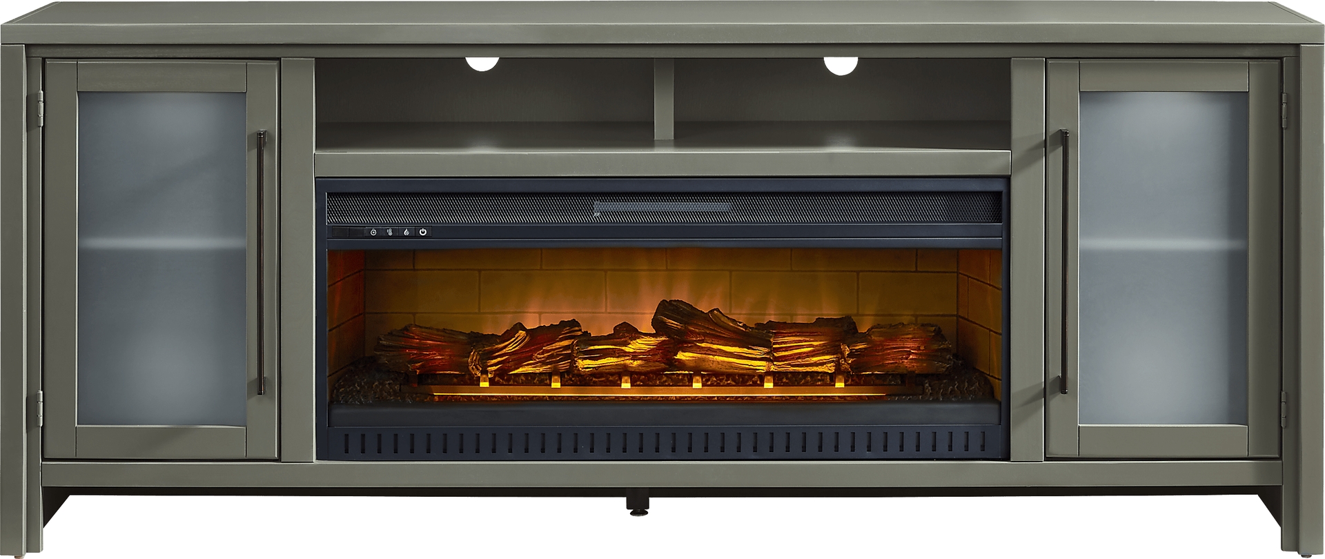 Relaxation is met with warmth and character in the Redmond console, creating a tranquil atmosphere of style and comfort. Crafted from poplar wood with maple veneers in an earthy sage finish, this contemporary piece features a refined silhouette with a pristine square-shaped frame that adds simple sophistication to your space. Two middle cubbies allow you to display your favorite decorations, while spacious storage space lies behind two frosted glass doors with long, sleek metal handles in a black finish. Below the cubby, a removable fireplace portion features flickering flames and faux embers, working with or without heat for a warm ambiance year-round. For a final touch, wire management holes behind each shelf keep cords neatly concealed for all your media devices.
