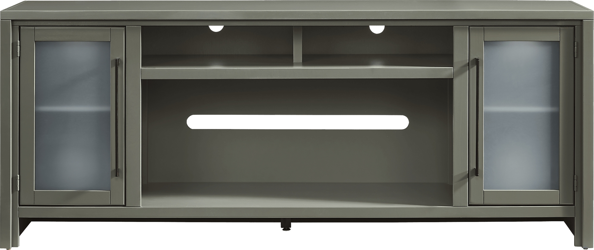 Relaxation is met with warmth and character in the Redmond console, creating a tranquil atmosphere of style and comfort. Crafted from poplar wood with maple veneers in an earthy sage finish, this contemporary piece features a refined silhouette with a pristine square-shaped frame that adds simple sophistication to your space. Spacious cubbies at the center allow you to display your favorite decorations, while extra storage space lies behind two frosted glass doors with long, sleek metal handles in a black finish. For a final touch, wire management holes behind each shelf keep cords neatly concealed for all your media devices.