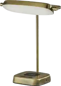 Modern functionality and mid-century modern styling meet in the Redvale Creek lamp. The lamp is anchored by a 6 square base in an antique brass finish supporting a matching metal stem leading to a rectangular shade. The shade houses an integrated, eco-friendly 8W LED light and a frosted diffuser for even lighting. With a touch smart switch conveniently located on the base, this lamp offers a full-range dimmer and five color temperature settings, making the perfect lighting available at the touch of a finger. For added functionality, the base of the lamp houses an integrated Qi-certified charging pad, supporting 5W charging on contact to get your phone from 0% to 100% in just 3-4 hours. A USB port is also located on the side of the base for charging a second device simultaneously. Partial assembly may be required.