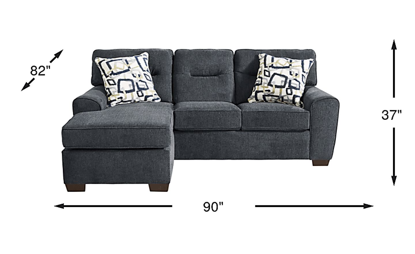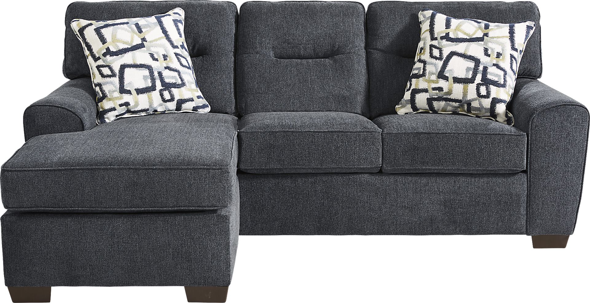Host in style with the Redwood Park sectional. Its transitional design and navy chenille fabric pairs well with various styles. Perfect for lounging, the chaise offers versatile seating. Its low-profile arms add a relaxed look. Extending the lifetime of your sectional, seat cushions are loose and reversible. Welted seams and channeled backs add eye-catching details. Included toss pillows add pops of gray, blue and brown against the neutral tone. 100% Polyester.