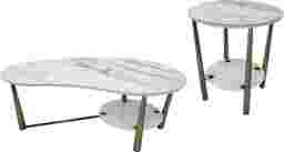 Champagne and caviar vibes meet South Beach chic in the Renata collection. The cocktail table's pièce de resistance is a sintered stone top that's free-formed in a playful yet très luxe kidney shape. Sleek gold-tone metal legs support the table as a whole and the floating shelf that rests beneath the table's top. A matching round end table completes the set.