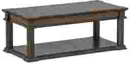 Clean, crisp lines and eye-catching design make the Renfield cocktail table an inviting talk piece for your contemporary living room. Constructed of poplar solids with oak veneers finished in a warm walnut brown, it includes a lower shelf that is perfect for storage or displays.