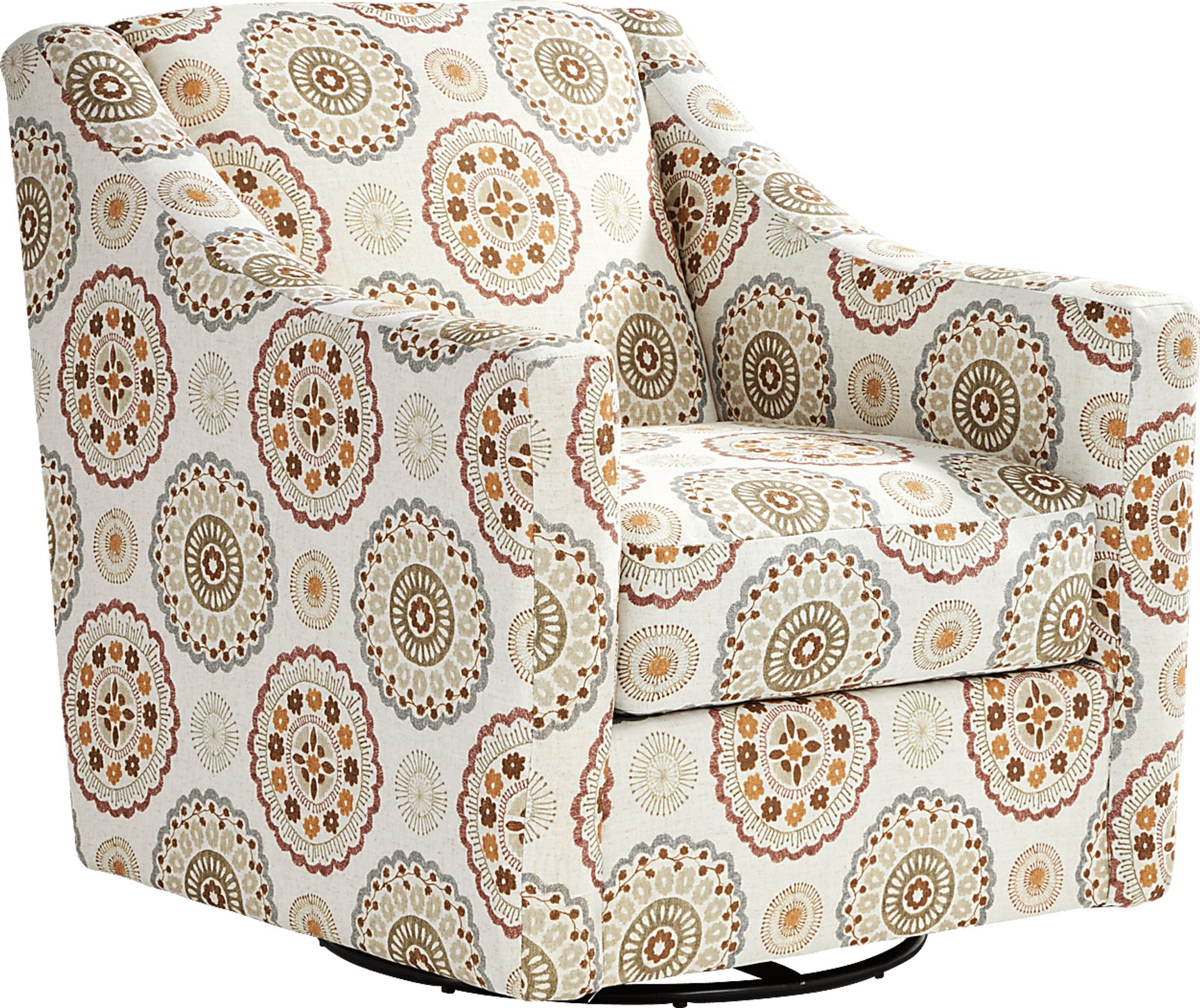 Traditional style meets casual comfort with the Reno Hills swivel chair. This chair's woven upholstery is accented with bursts of orange and gray geometric floral patterning offset against neutral beige. Featuring sloping wedge arms with a detached cushion seat, the chair also has a swivel base for easy side to side movement. Upholstery: 100% Polyester.