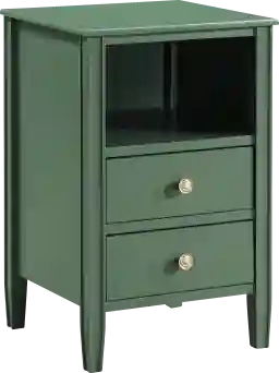 This nightstand features a transitional design that blends traditional fluted, tapered legs with contemporary gold-finished hardware. The sophisticated green finish serves as a unique statement piece that complements botanical themes, neutral palettes, or modern "glam" decors in both primary and guest bedrooms.