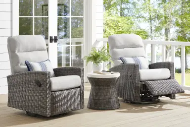 This 3-piece seating piece brings high-end indoor comfort outside. It features pull-handle reclining on both the left-arm and right-arm facing seats, allowing for easy manual adjustment. The movement is enhanced by gliding functionality, and the center padded console provides integrated storage and two cupholders, keeping your outdoor essentials organized and within reach.