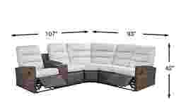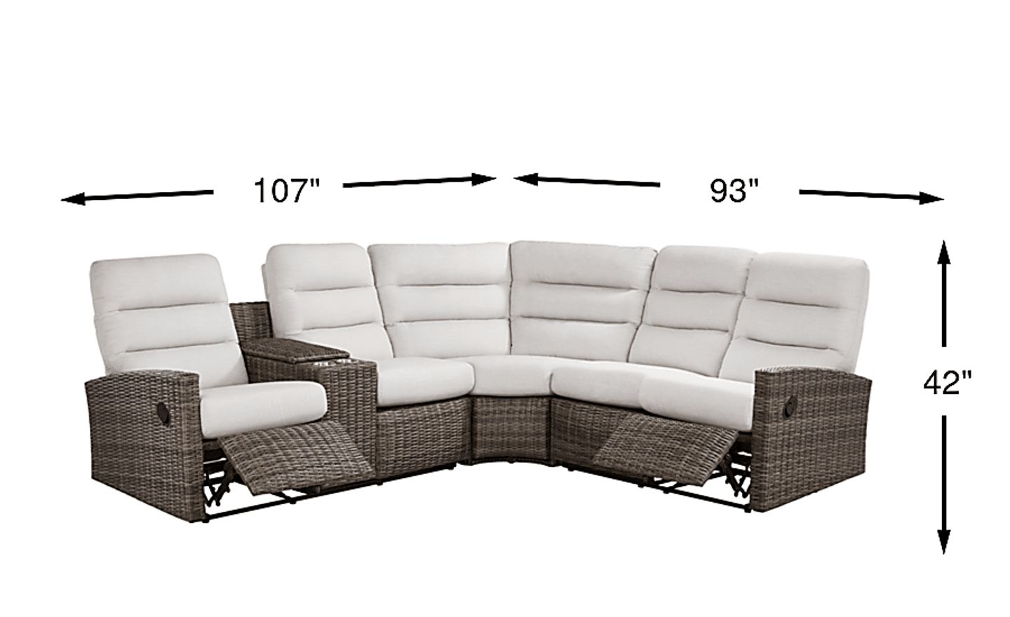 Casual outdoor style finds a new angle in the arcing curves and gentle lines of the Ria reclining sectional. With an all-weather aluminum frame wrapped in driftwood colored wicker, this unique seating piece offers pull-handle reclining on left arm and right-arm facing seats. A padded console adds convenient storage and two cupholders. The backs and seats are fully upholstered in a UV-resistant gray outdoor fabric with chambered cushions for added support.