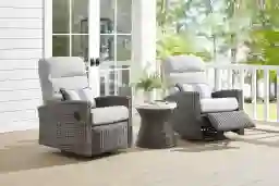 This set provides a versatile 3-in-1 motion experience. Each chair includes a convenient swivel base for 360-degree rotation, a pull-handle reclining mechanism for personalized comfort, and a soothing gliding function. This combination makes them ideal for transitioning between active conversation and relaxed lounging.