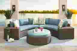 Set the stage for outdoor entertaining with the Rialto sectional. This inviting curved sectional, made with brown all-weather wicker over a fully-welded aluminum frame, boasts seating for up to four people. Cozy cushions are covered with durable solution-dyed performance fabric in a soothing aqua color. The four included accent pillows are reversible with a matching solid aqua color on one side and a decorative pattern on the other. Two wedge tables each include a drink holder.