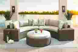 Set the stage for outdoor entertaining with the Rialto sectional. This inviting curved sectional, made with brown all-weather wicker over a fully-welded aluminum frame, boasts seating for up to six people. Cozy cushions are covered with durable solution-dyed performance fabric in a neutral putty color. The included round ottoman serves as extra seating for gatherings or the ideal footrest anytime. Two wedge tables each include a drink holder.