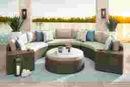 Set the stage for outdoor entertaining with the Rialto sectional. This inviting curved sectional, made with brown all-weather wicker over a fully-welded aluminum frame, boasts seating for up to nine people. Cozy cushions are covered with durable solution-dyed performance fabric in a neutral putty color. The included round ottoman serves as extra seating for gatherings or the ideal footrest. Two wedge tables each include a drink holder.