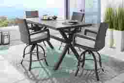 With seating space for up to six, the bar height Rialto dining table is a fantastic choice for your outdoor paradise. The sleek frame, designed to withstand the elements, is crafted with powder coated aluminum in a brown finish. A stylish rectangular slat top completes the inviting appeal. For warmer days when you need a bit of shade, the table features a convenient umbrella hole with cap.