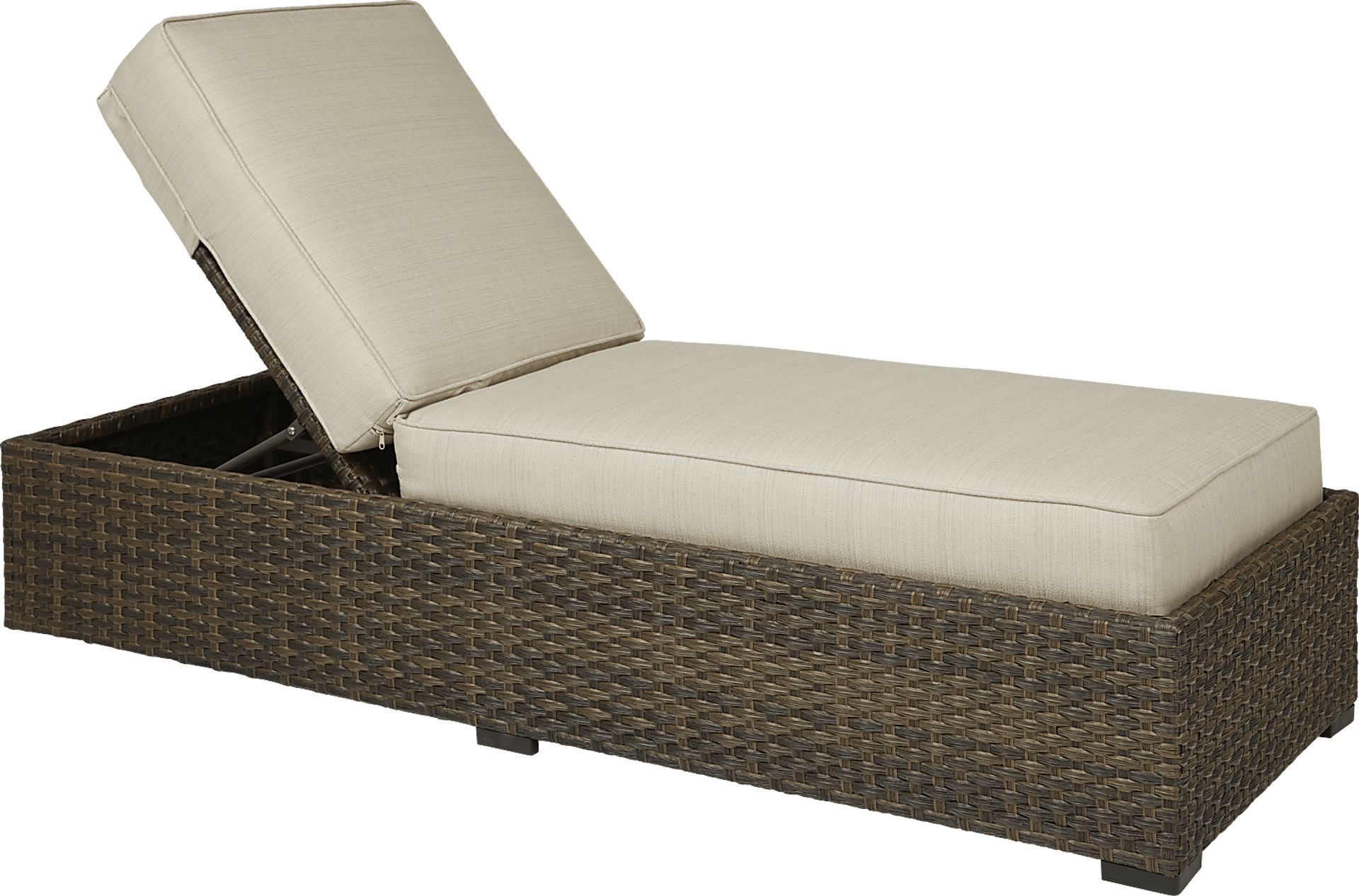 Create a true lounging experience with the Rialto outdoor chaise. The comfortable piece is crafted with brown all-weather wicker over a fully-welded aluminum frame. Cushions covered with durable solution-dyed performance fabric are rendered in a neutral beige color while the adjustable back can be raised or lowered to find the perfect position. When it's time to move the chaise to catch the best rays, wheels on the bottom make movement easy.