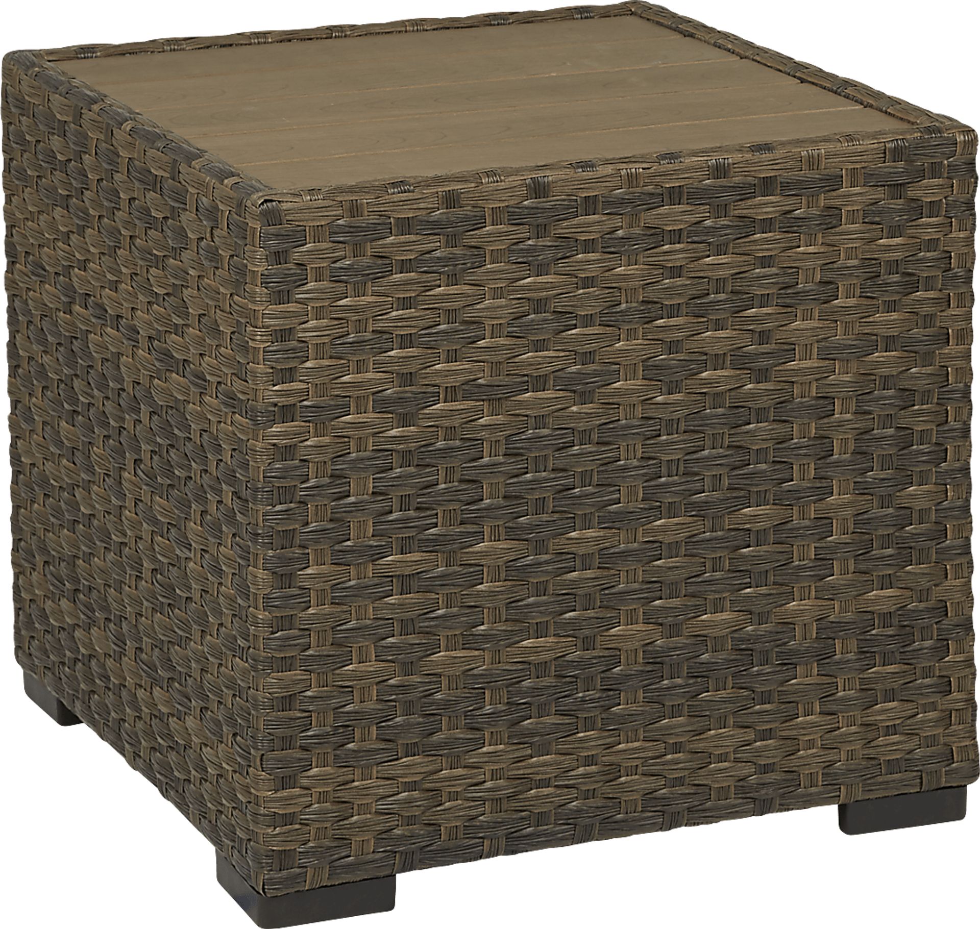 An easy addition to almost any outdoor setting, the Rialto end table is the perfect spot to place drinks and more. The 22 inch square table features a plank style top and is crafted with brown all-weather wicker over a fully-welded aluminum frame.